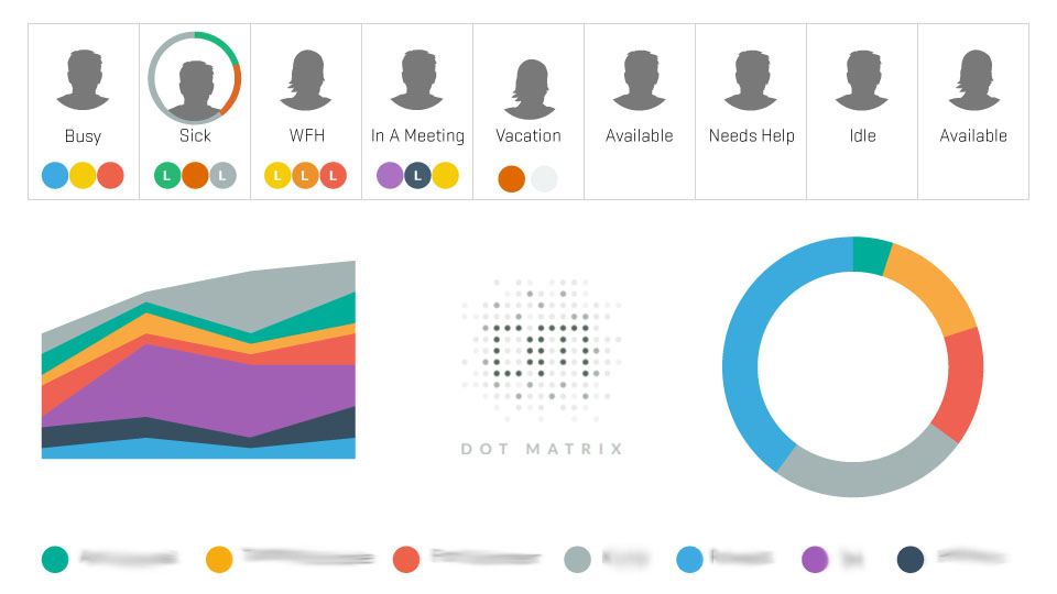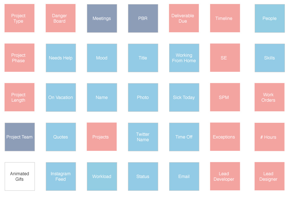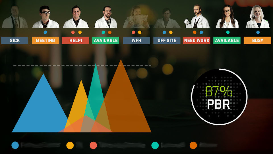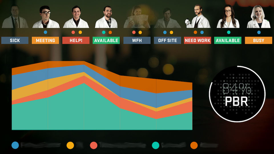 When all four teams have their own dashboard displaying information on each person and project; the data could be aggregated into one large stream to be shown in the main area of the office. The summation of information can help with forecasting timelines, when large amounts of people are unavailable, and comparing to historic data for future planning.