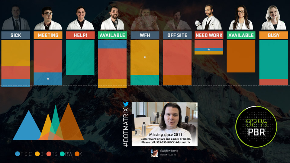 With this in mind I personally spent $50 and a weekend to get back into my roots in college; Linux and Networking. Before long I created a web server that displays a page in Chromium's kiosk mode that displayed our team logo and a Twitter feed for a hashtag. It had a huge impact on team morale, despite how low fidelity the design was. People from other teams were tweeting, other departments were interested in the concept, and people had fun putting photos on the stream when traveling.