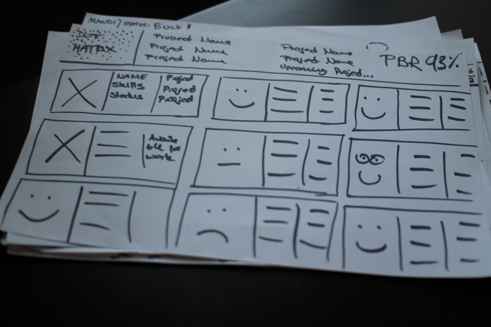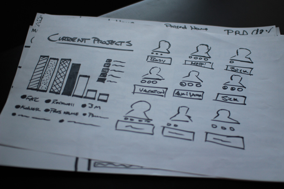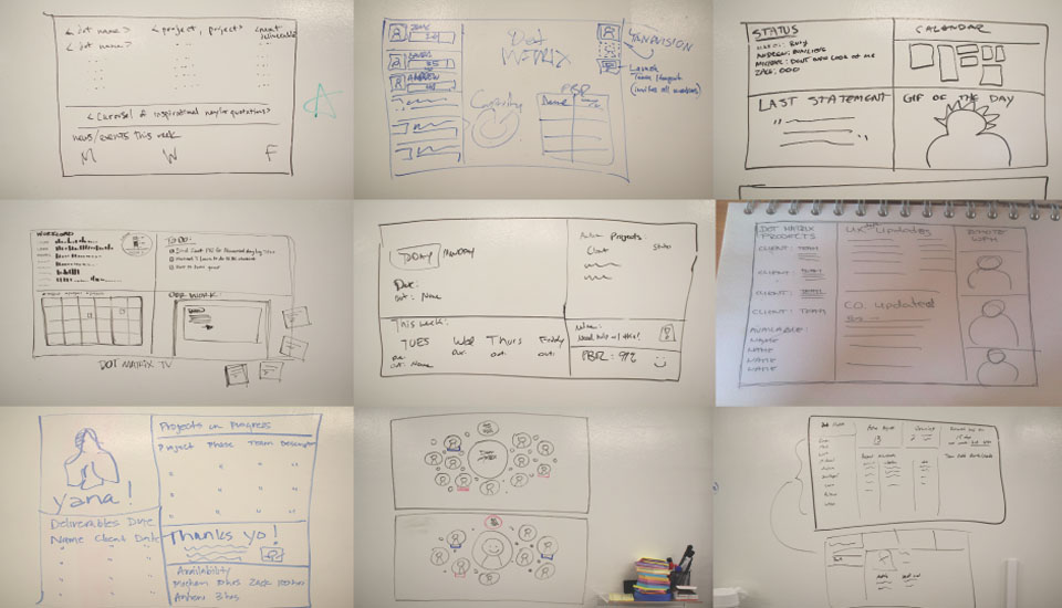 Despite our limitations on what data about our company we could access, we sketched out ideas with further rules in mind: Must be readable from 15ft away, Users cannot interact with the information, Data cannot reveal client information, All data must be derived from employees and projects.